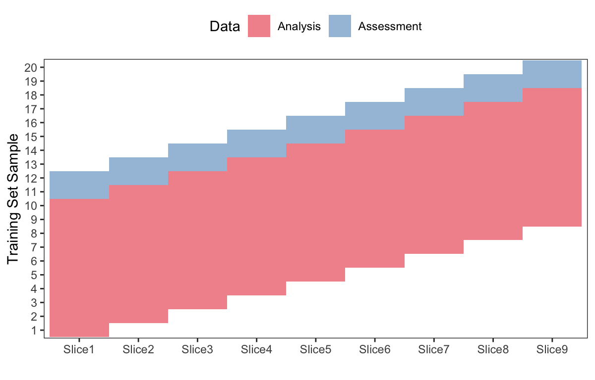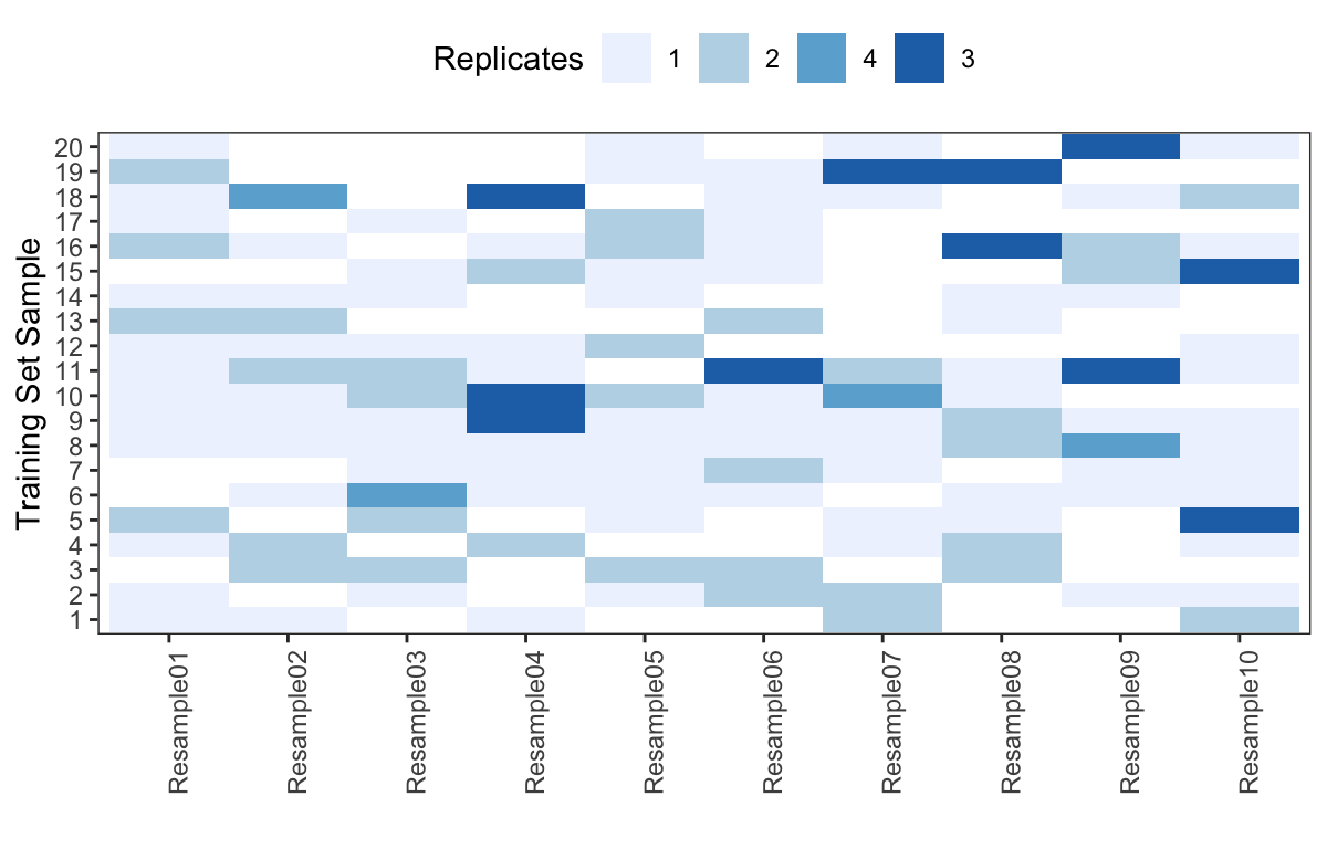 Figure 3.6 shows a diagram of 10-fold cross-validation for a hypothetical data set with 20 training set samples. For each resample, two different training set data points are held out for the assessment set. Note that the assessment sets are mutually exclusive and contain different instances.