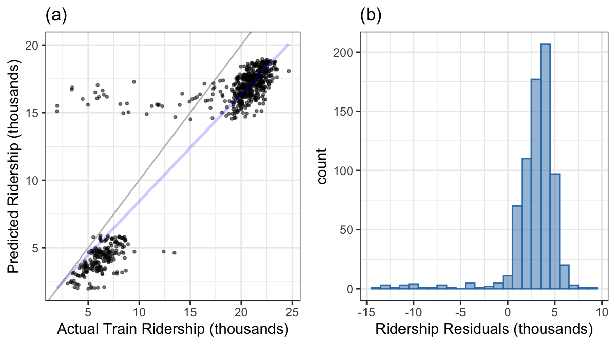 To illustrate the problems with \(R^2\), let’s look at the results of one particular model of the Chicago train ridership data. For this model \(R^2\) was estimated to be 0.9; at face value we may conclude that this is an extremely good model. However, the high value is mostly due to the inherent nature of the ridership numbers which are high during the workweek and correspondingly low on the weekends. The bimodal nature of the outcome inflates the outcome variance and, in turn, the \(R^2\). We can see the impacts of the bi-modal outcome in Figure 3.1 (a). Part (b) of the figure displays a histogram of the residuals, some of which are greater than 10K rides. The RMSE for this model is 3,853 rides, which is somewhat large relative to the observed ridership values.