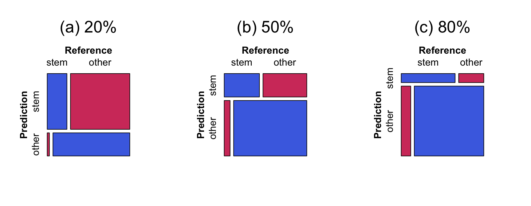 When the outcome is a discrete set of values (i.e., qualitative data), there are two different types of performance metrics that can be utilized. The first type described below is based on qualitative class prediction (e.g., stem or other) while the second type uses the predicted class probabilities to measure model effectiveness (e.g., Pr[stem] = 0.254).
