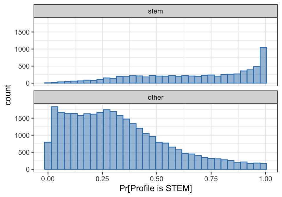 The question that one really wants to know is “if my value was predicted to be an event, what are the chances that it is truly is an event?” or Pr[Y = STEM|P = STEM]. Thankfully, the field of Bayesian analysis (McElreath 2015) has an answer to this question. In this context, Bayes’ Rule states that