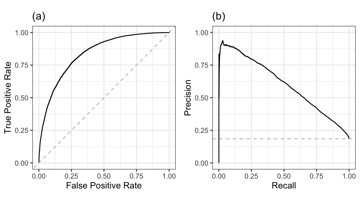 From the information retrieval point of view, the precision-recall curve is more appropriate (Christopher, Prabhakar, and Hinrich 2008). This is similar to the ROC curve in that the two statistics are calculated over every possible cutoff in the data. For the OkCupid data, the curve is shown in Figure 3.4(b). A poor model would result in a precision-recall curve that is in the vicinity of the horizontal grey line that is at the value of the observed prevalence (0.18 here). The area under the curve is used to summarize model performance. The best possible value is 1.0, while the worst is the prevalence. The area under this curve is 0.603.