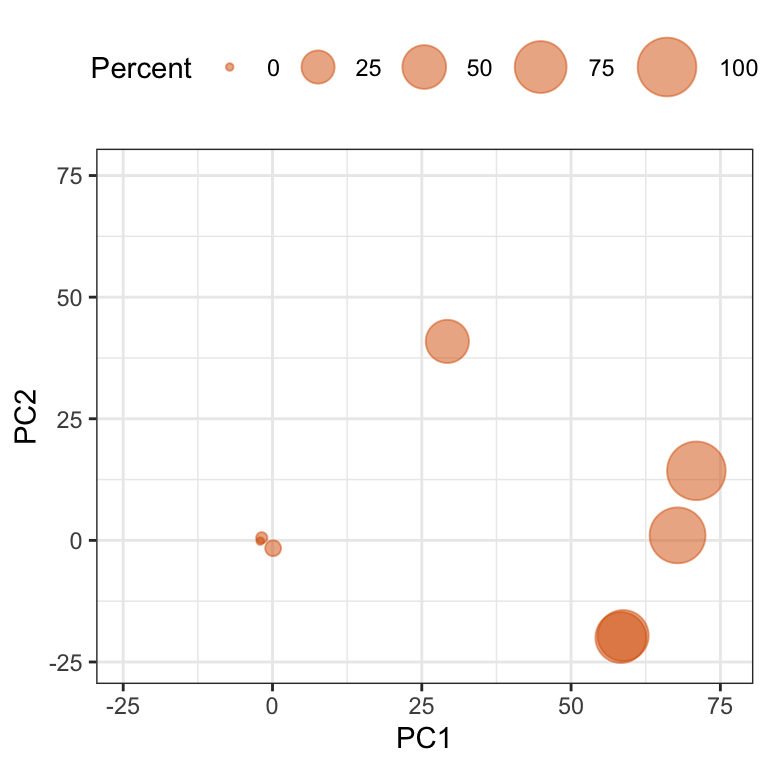 The same approach can be applied to understanding the degree of missingness among the predictors. To do this, the binary matrix representing missing values is first transposed so that predictors are now in the rows and the samples are in the columns. PCA is then applied to this matrix and the resulting dimensions now capture variation cause by the presence of missing values across the predictors.