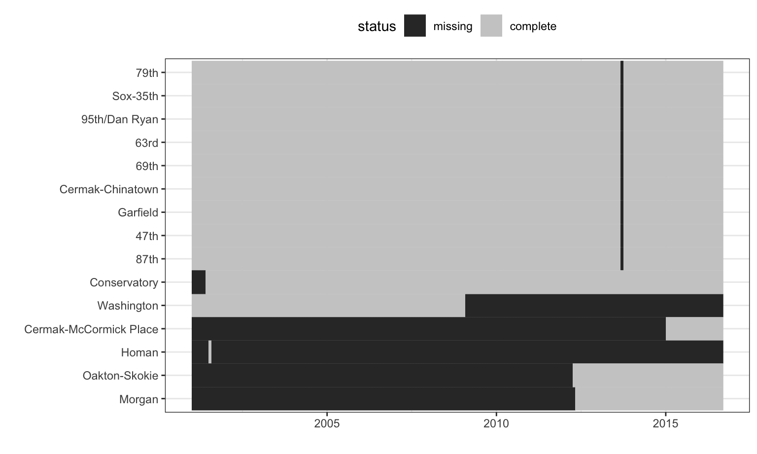 The stations with excessive missingness and their missing data patterns over time are shown in Figure 8.5. The station order is set using a clustering algorithm while the x-axis is ordered by date. There are nine stations whose data are almost complete except for a single month gap. These stations are all on the Red Line and occur during the time of the Red Line Reconstruction Project that affected stations north of Cermak-Chinatown to the 95th Street station. The Homan station only has one month of complete data and was replaced by the Conservatory station which opened in 2001, which explains why the Conservatory station has missing data prior to 2001. Another anomaly appears for the Washington-State station. Here the data collection ceased midway through the data set because the station was closed in the mid-2000s. The further investigation of the missing data indicates that these patterns are unrelated to ridership and are mostly due structural causes.