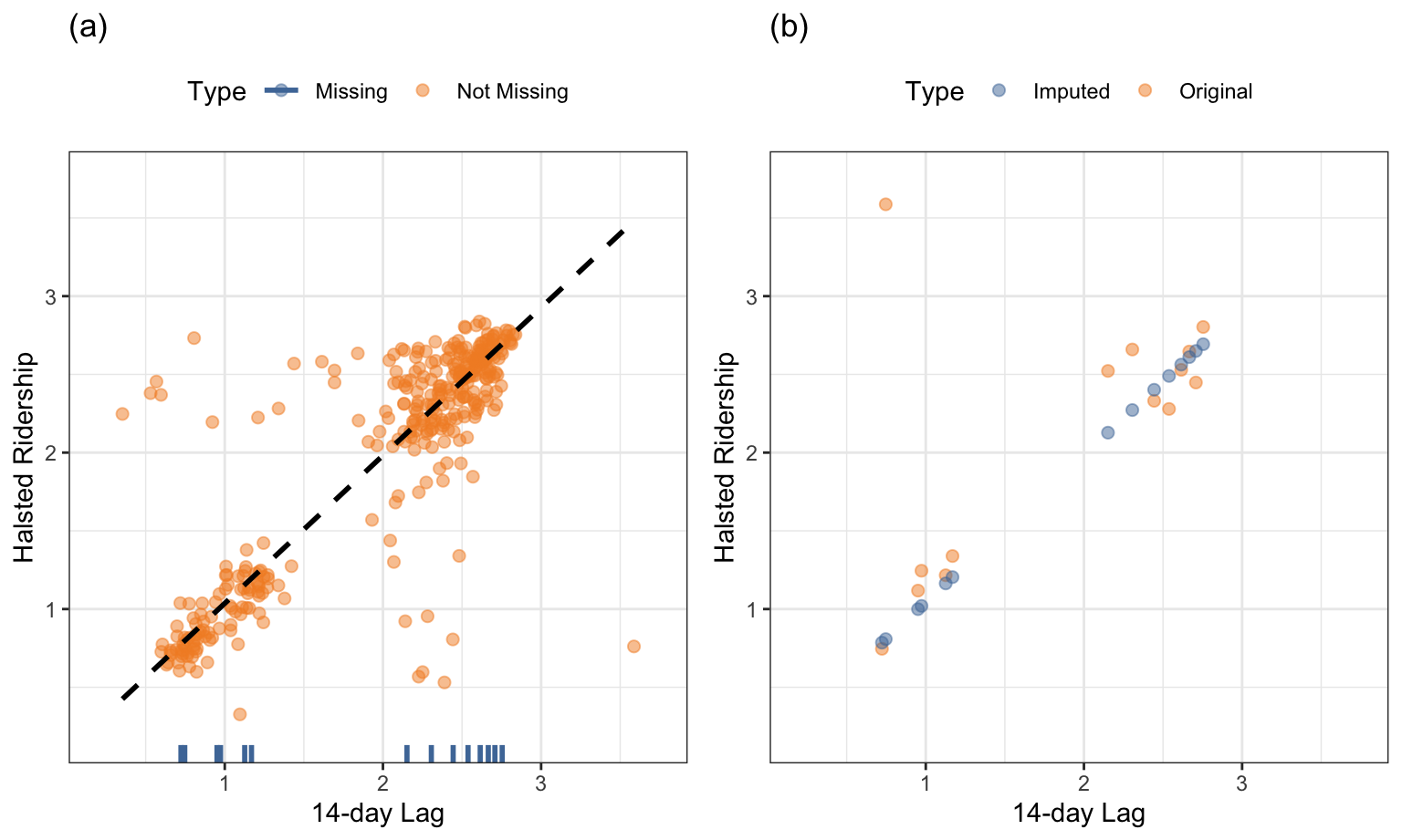 The Chicago train ridership data will be used to illustrate the usefulness of a simple technique like linear regression for imputation. It is conceivable that one or more future ridership values might be missing in random ways from the complete data set. To simulate potential missing data, missing values have been induced for ridership at the Halsted stop. As illustrated previously in Figure 4.7, the 14-day lag in ridership within a stop is highly correlated with the current day’s ridership. Figure 8.8(a) displays the relationship between these predictors for the Halsted stop in 2010 with the missing values of the current day highlighted on the x-axis. The majority of the data displays a linear relationship between these predictors, with a handful of days having values that are away from the overall trend. The fit of a robust linear model to these data is represented by the dashed line. Figure 8.8(b) compares the imputed values with the original true ridership values. The robust linear model performs adequately at imputing the missing values, with the exception of one day. This day had unusual ridership because it was a holiday. Including holiday as a predictor in the robust model would help improve the imputation.