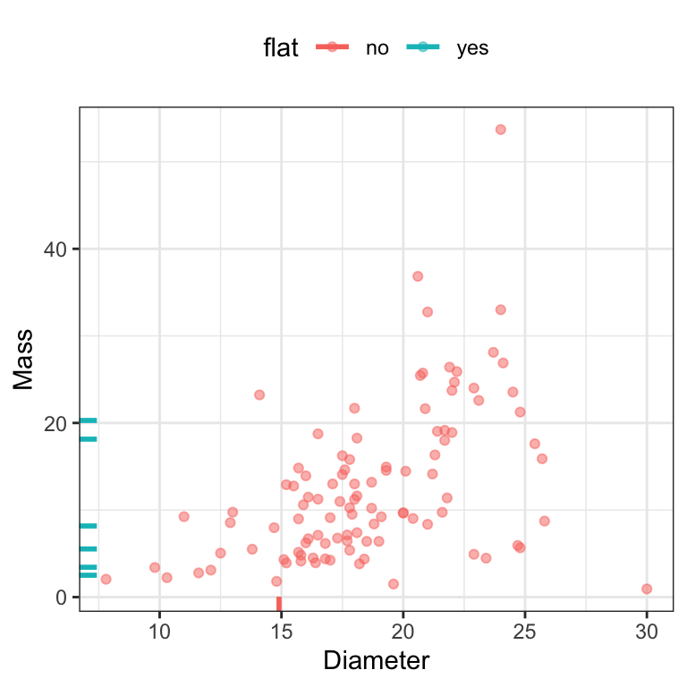 In addition to exploring the global nature of missing information, it is wise to explore relationships within the data that might be related to missingness. When exploring pairwise relationships between predictors, missing values of one predictor can be called out on the margin of the alternate axis. For example, Figure 8.2 shows the relationship between the diameter and mass of the feces. Hash marks on either axis represent samples that have an observed value for that predictor but have a missing value for the corresponding predictor. The points are colored by whether the sample was a “flat puddle that lacks other morphological traits.” Since the missing diameter measurements have this unpalatable quality, it makes sense that some shape attributes cannot be determined. This can be considered to be structurally missing, but there still may be a random or informative component to the missingness.