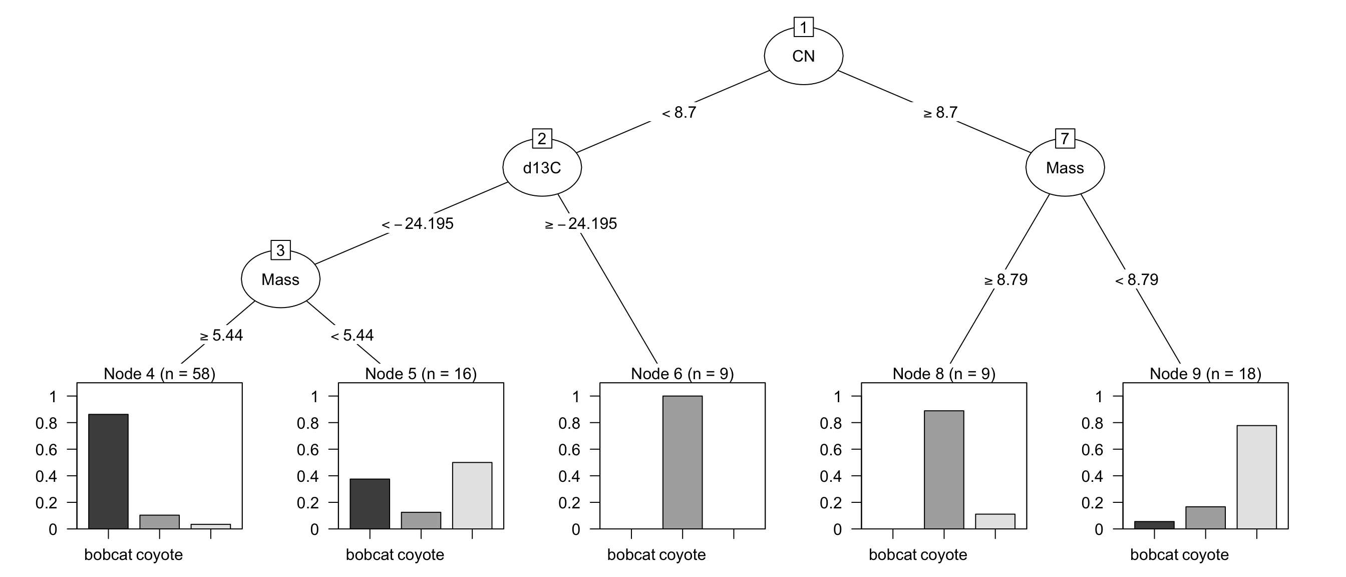 C5.0 (Quinlan 1993; Kuhn and Johnson 2013) takes a different approach. Based on the distribution of the predictor with missing data, fractional counts are used in subsequent splits. For example, this model’s first split for the scat data is d13C > 24.55. When this statement is true, all 13 training set samples are coyotes. However, there is a single missing value for this predictor. The counts of each species in subsequent nodes are then fractional due to adjusting for the number of missing values for the split variable. This allows the model to keep a running account of where the missing values might have landed in the partitioning.