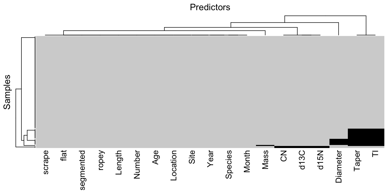 When the training set has a moderate number of samples and predictors, a simple method to visualize the missing information is with a heatmap. In this visualization the figure has two colors representing the present and missing values. The top of Figure 8.1 illustrates a heatmap of missing information for the animal scat data. The heatmap visualization can be reorganized to highlight commonalities across missing predictors and samples using hierarchical cluster analysis on the predictors and on the samples (Dillon and Goldstein 1984). This visualization illustrates that most predictors and samples have complete or nearly complete information. The three morphological predictors (diameter, taper, and taper index) are more frequently missing. Also two samples are missing all three of the laboratory measurements (d13N, d15N, and CN).