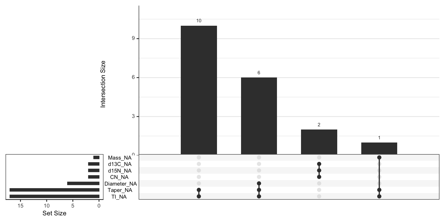 However, in relation to the outcome, the six flat samples were spread across the gray fox (\(n=5\)) and coyote (\(n=1\)) data. Given the small sample size, it is unclear if this missingness is related to the outcome (which would be problematic). Subject-matter experts would need to be consulted to understand if this is the case.