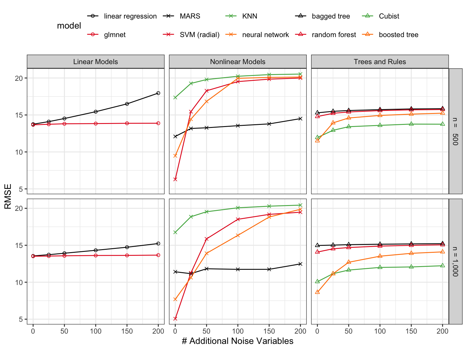 Before proceeding, let’s examine the effect of irrelevant predictors on different types of models and how the effect changes over different scenarios.